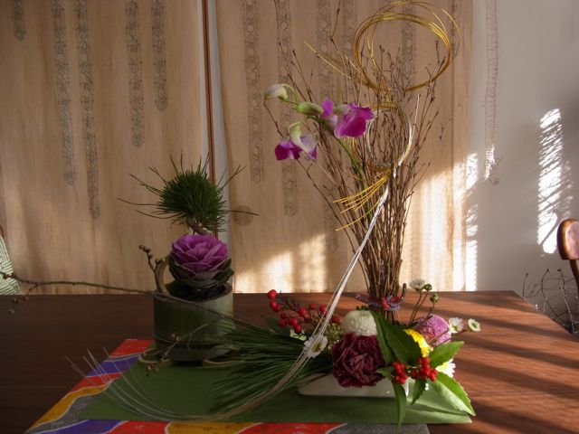 左手の青竹は、松と葉牡丹、ヤブコウジを