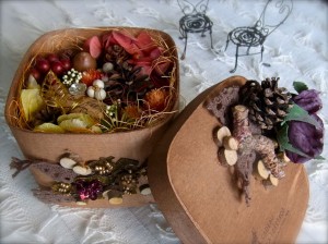 森の宝石箱 2012年9月17日 qualia ウッド素材のBOXに 懐かしい松ぼっくりやドングリや・・・ 木の実やドライフラワーを詰めました。 フタを閉めた外観は、とてもシックで アンティークなイメージ。 サプライズプレゼントにいかが? 誰にもあげたくない方は、 この暑かった夏に頑張った自分へのご褒美にしましょう♥ コメントを残すメールアドレスが公開されることはありません。 ※ が付いている欄は必須項目ですコメント ※ 名前 ※ メール ※ サイト 次回のコメントで使用するためブラウザーに自分の名前、メールアドレス、サイトを保存する。