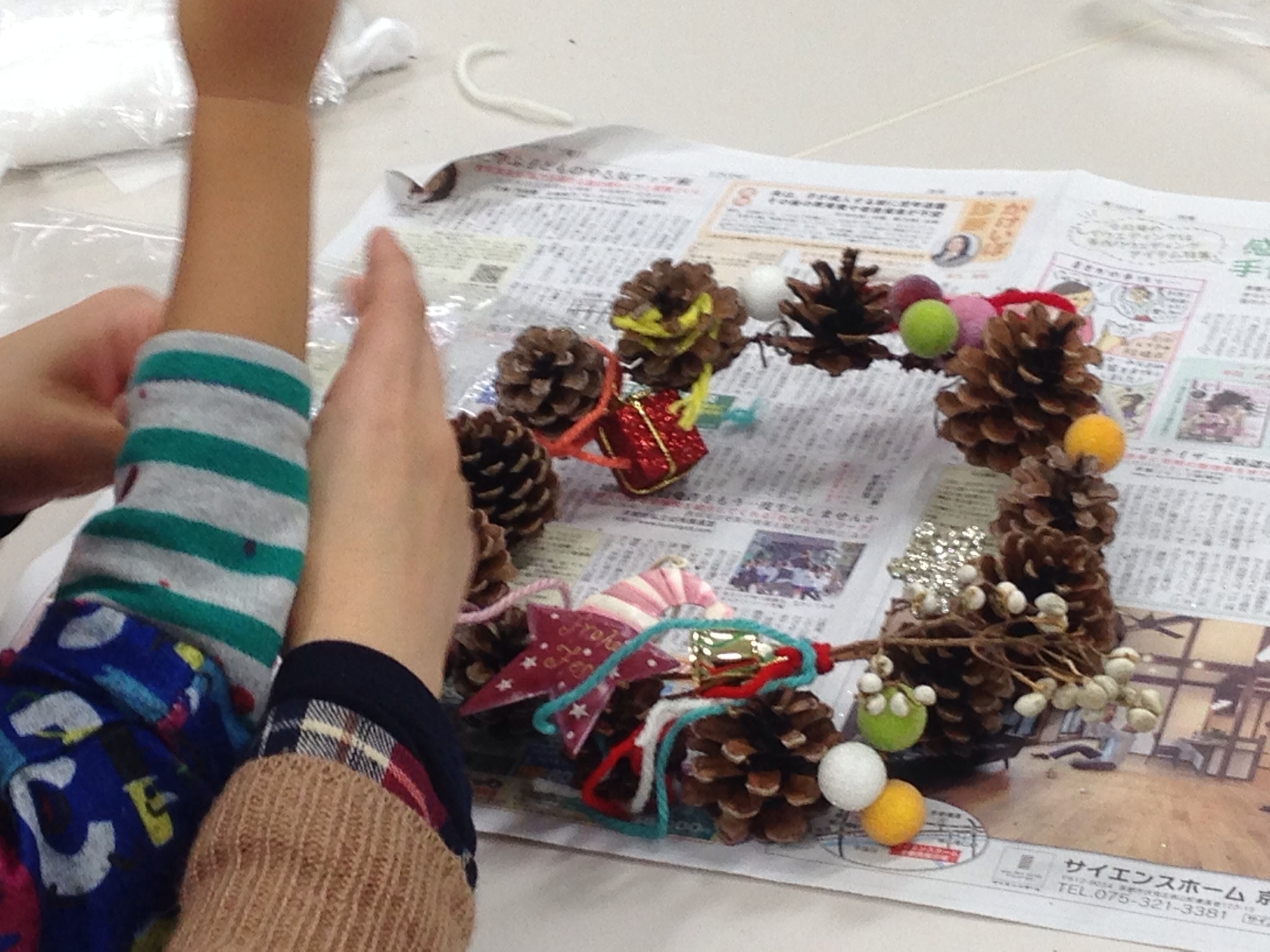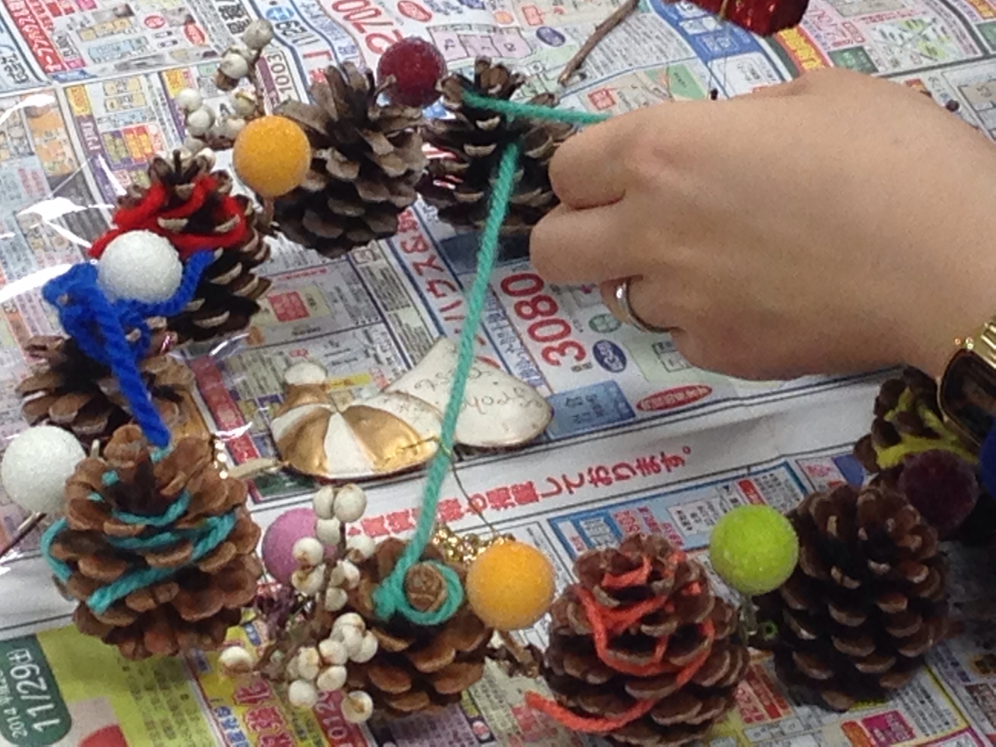 子供リース教室 2014年11月30日 qualia 2ヶ月に一回のペースで開催のお花の会 今月はもちろんリースです。 台して「リースを作ってサンタさんを呼ぼう」 松ぼっくりを沢山つないで、色とりどりの毛糸を色々工夫して飾り、とっても可愛いリースが完成。 3歳や年少さんの親子さんが多く来られて、可愛い笑い声に包まれた楽しいひと時になりました。 コメントを残すメールアドレスが公開されることはありません。 ※ が付いている欄は必須項目ですコメント ※ 名前 ※ メール ※ サイト 次回のコメントで使用するためブラウザーに自分の名前、メールアドレス、サイトを保存する。